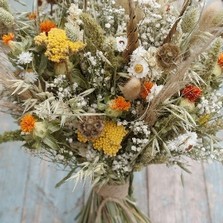 Pampas Grass, Pheasant Feathers, Larkspur, Oats, Wheat ,Scabiosa, Babys Breath, Amaranthus, Yarrow, Daisies, Carthamus, Harestail, Grasses.