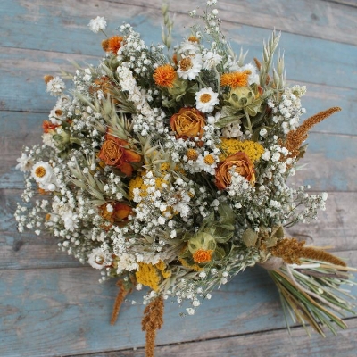 Orange Roses, Carthamus, Larkspur, Babys Breath, Daisy, Oats, Amaranthus, Yarrow.