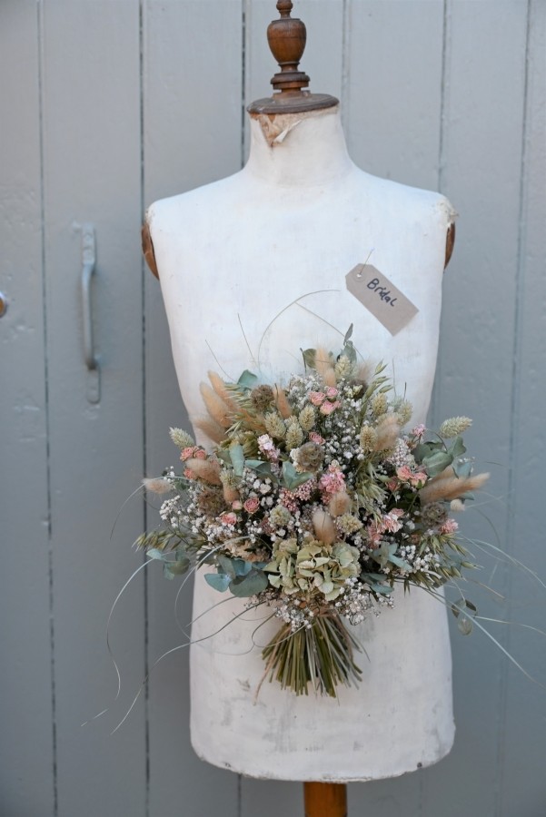 Pink Roses, Gypsophilia, Oats, Grasses, Scabiosa, Eucalyptus, Hydrangea.