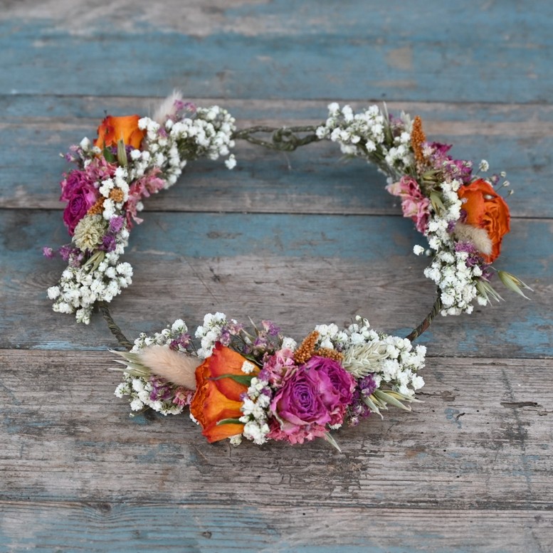 Our handmade dried flower hair crowns are a great alternative for creating a wild, bohemian look to your wedding.