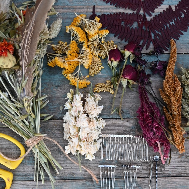 This collection of sunset reds, oranges, yellows and natural dried flowers are being sold as a DIY box of flowers for you to make your own hair combs and hair grips.