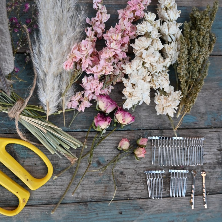 This collection of mixed pink and natural dried flowers are being sold as a DIY box of flowers for you to make your own hair combs and hair grips.