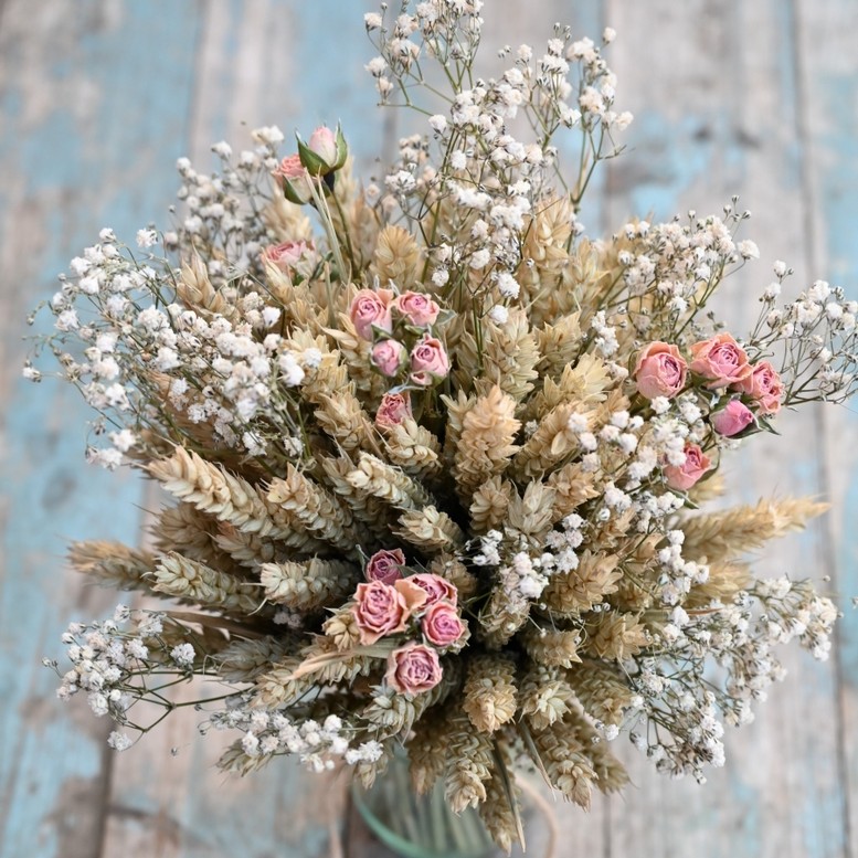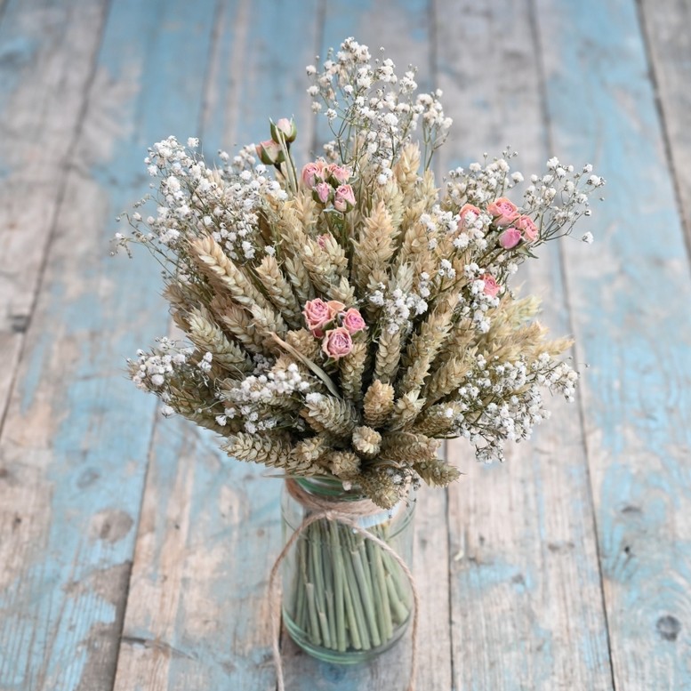 Our rustic, dried flower posies in jam jars are a very versatile choice for decorating your wedding venue or your home.