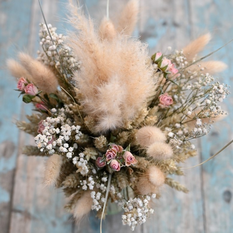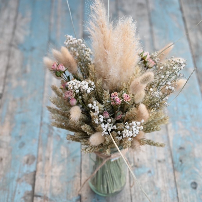 Our rustic, dried flower posies in jam jars are a very versatile choice for decorating your wedding venue or your home.