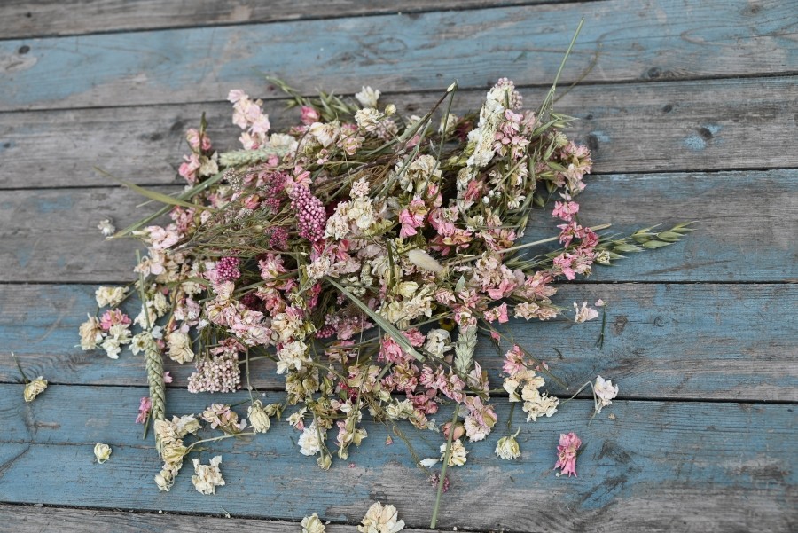 Random assorted sized dried flowers, petals, flower heads and shorter stem length flowers and grasses.