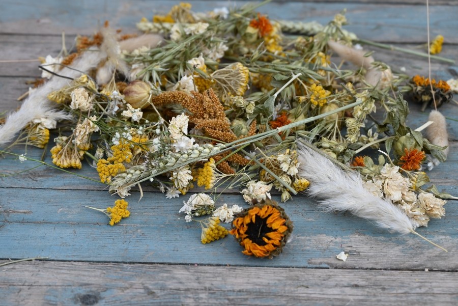 Random assorted sized dried flowers, petals, flower heads and shorter stem length flowers and grasses.
