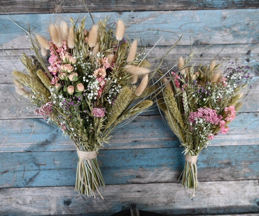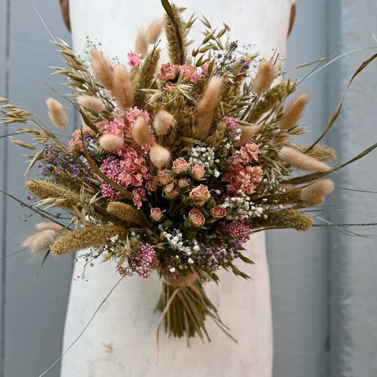 Wheat, Oats, Harestail, Setaria, Grasses, Gypsophilia, Larkspur, Rice Flower, Roses.