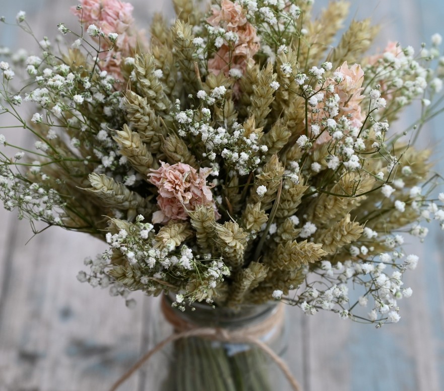 Our rustic, dried flower posies in jam jars are a very versatile choice for decorating your wedding venue or your home.