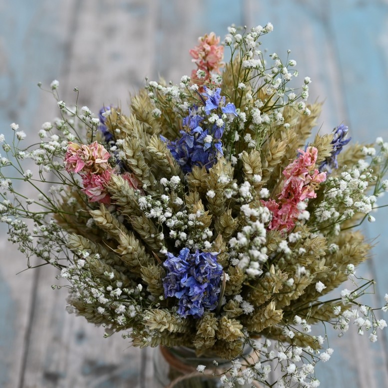 Our rustic, dried flower posies in jam jars are a very versatile choice for decorating your wedding venue or your home.