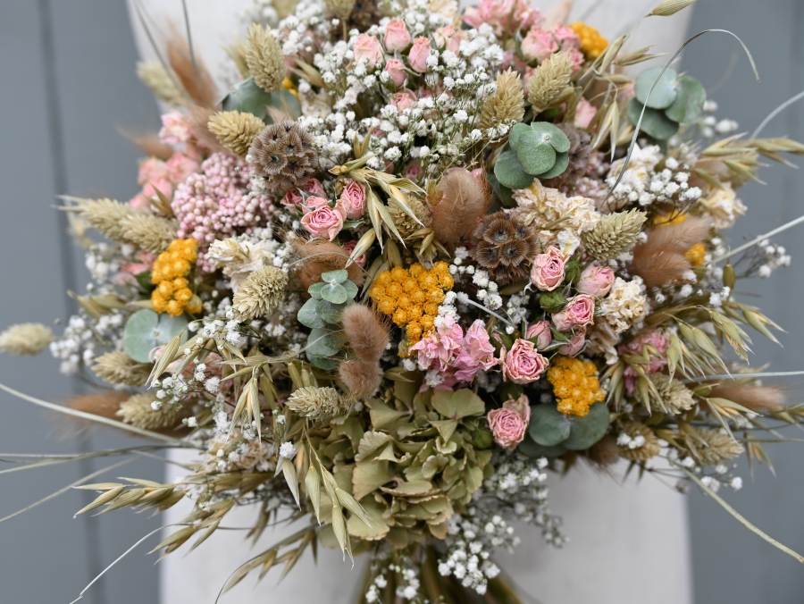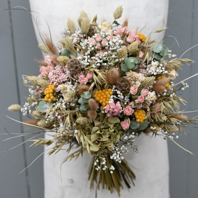 Pink Roses, Gypsophilia, Oats, Grasses, Scabiosa, Eucalyptus, Hydrangea and a twist of yellow Lonas.