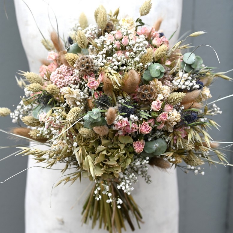 Pink Roses, Gypsophilia, Oats, Grasses, Scabiosa, Eucalyptus, Hydrangea with a twist of Thistles.