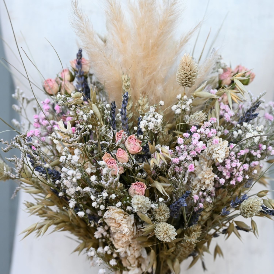 Baby's Breath, Roses, Limonium, Larkspur, Lavender, Grasses, Wheat, Pampas.