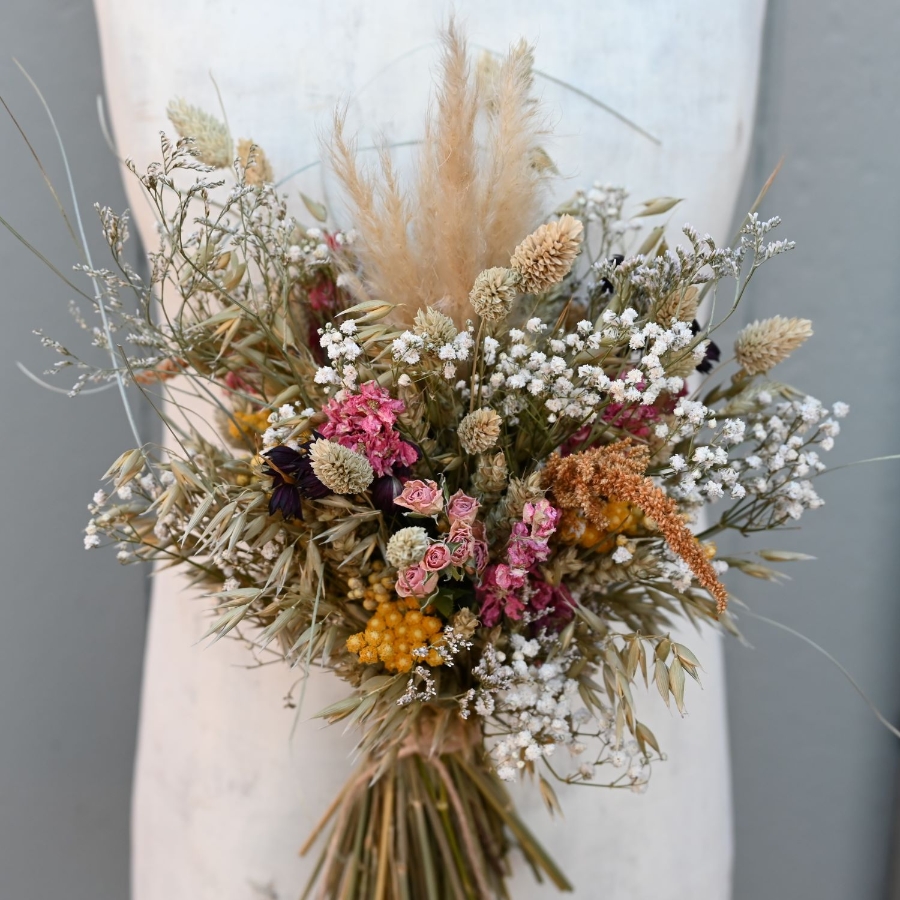 Baby's Breath, Oats, Lomas, Amaranthus, Astrantia, Roses, Limonium, Larkspur, Grasses, Wheat, Pampas.