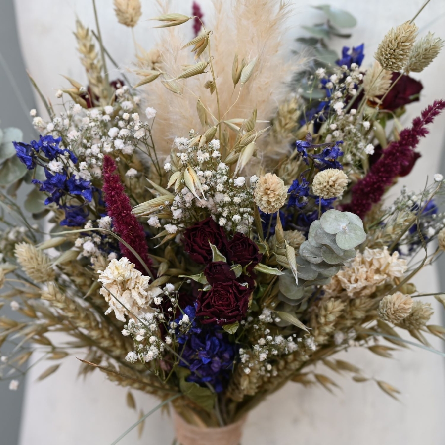 Baby's Breath, Eucalyptus, Amaranthus, Roses, Larkspur, Grasses, Wheat, Pampas.