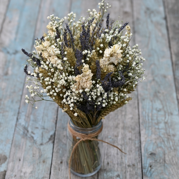 The jars have been simply tied with string at the top or you can use your own ribbons and fabrics to co-ordinate with your theme. The posies have been tied so that they can also be easily transferred to a vase/jug or other container, or just cut the string and leave them in the jar.