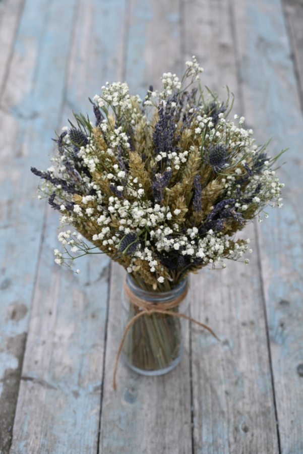 The jars have been simply tied with string at the top or you can use your own ribbons and fabrics to co-ordinate with your theme. The posies have been tied so that they can also be easily transferred to a vase/jug or other container, or just cut the string and leave them in the jar.