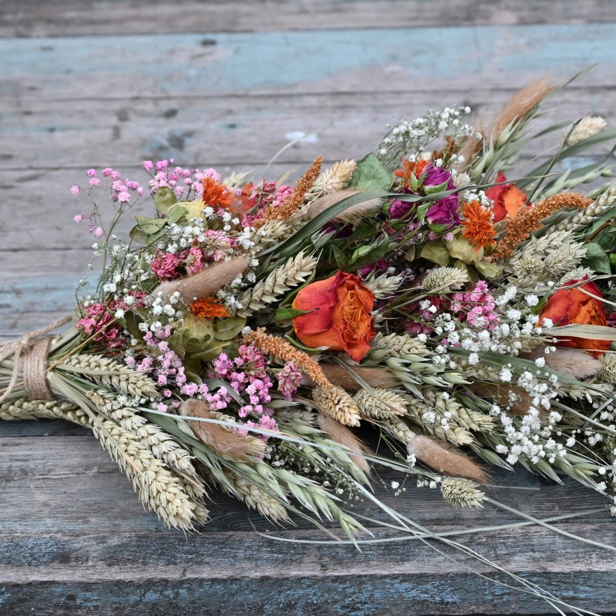 We have used Wheat as the main ingredient to give the design stability and then added a twist of flowers from the relevant collection.