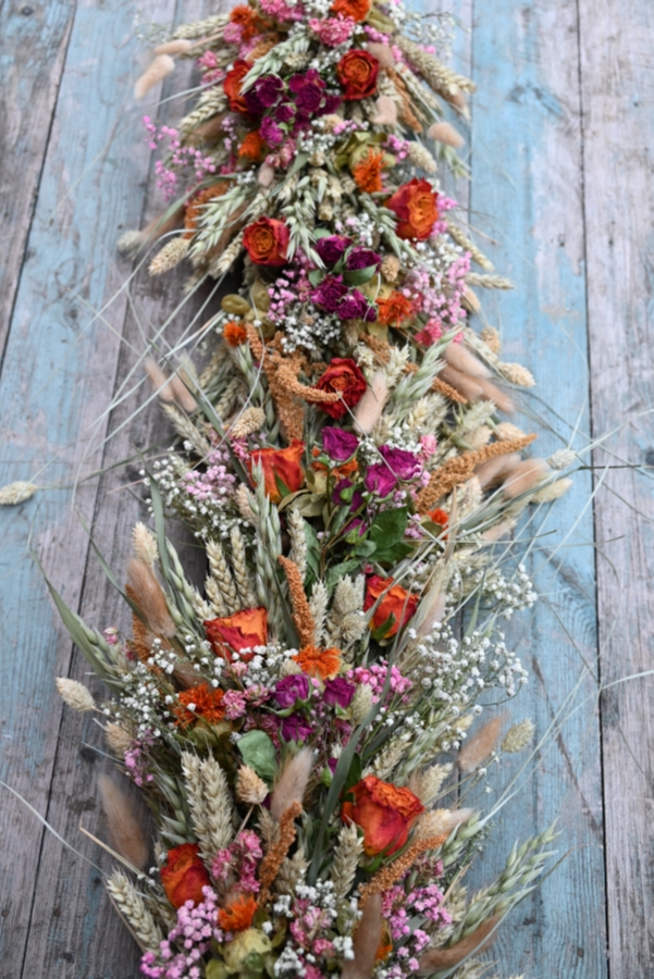 Our rustic, dried flower garlands are a very versatile choice for decorating your wedding venue. They will work on the ceremony table for the first part of the day and then as they are so lightweight they can easily be moved to the wedding breakfast top table. They are a great alternative for creating a wild, bohemian look to your day as you get to keep them, or give them away as a gift at the end of the day.