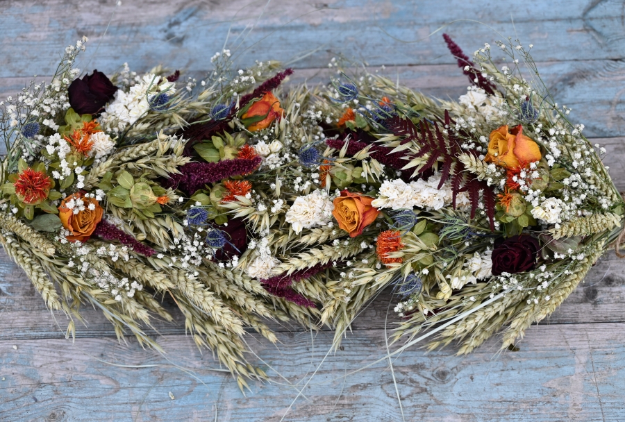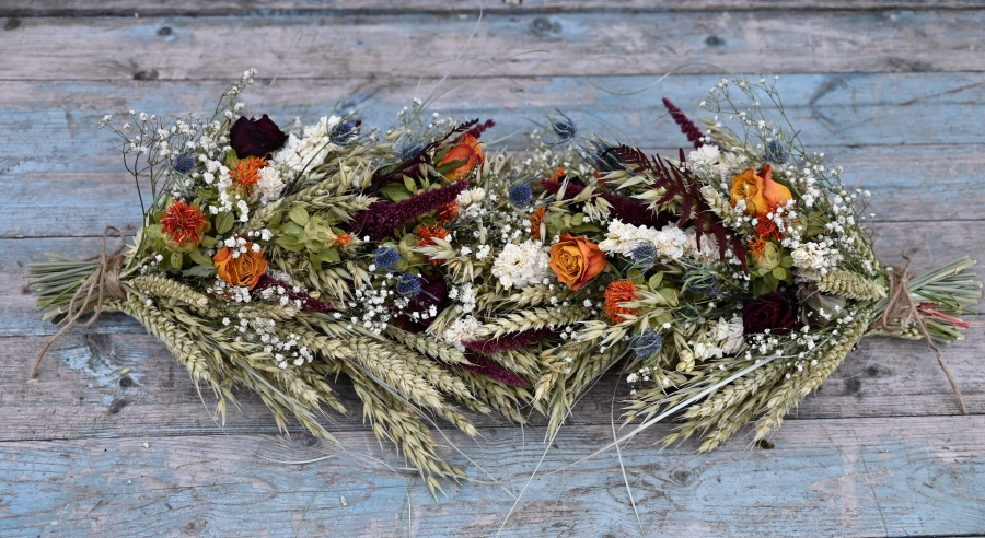 We have used Wheat as the main ingredient to give the design stability and then added a twist of flowers from the relevant collection.