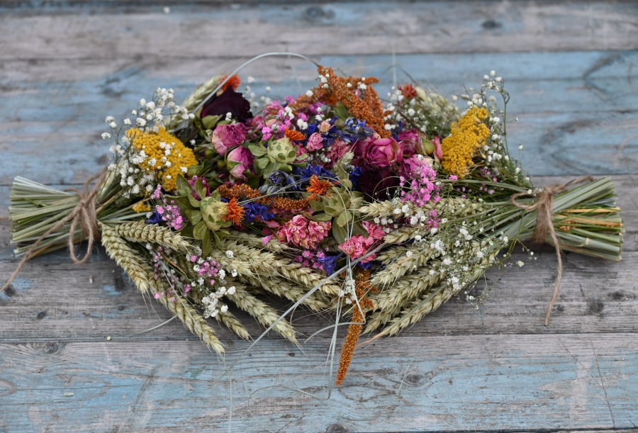 We have used Wheat as the main ingredient to give the design stability and then added a twist of flowers from the relevant collection.